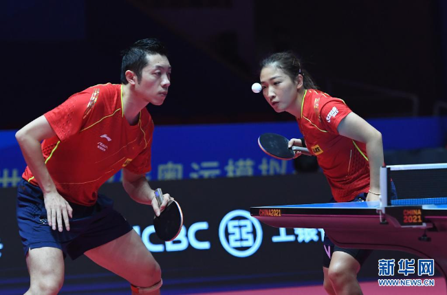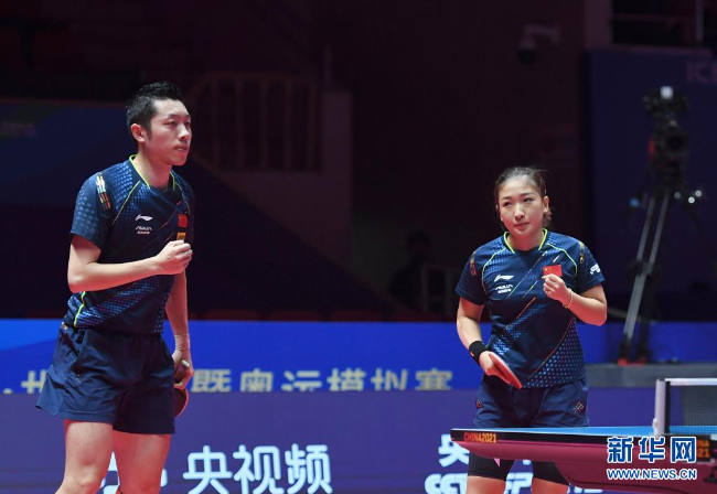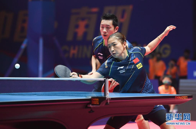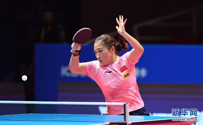 2021“直通WTT大满贯·世乒赛”暨奥运模拟赛27日继续在河南南阳举行。来自广东的奥运冠军刘诗雯一日四赛,她与许昕参加了两场混双小组赛以及一场1/4决赛,又和陈梦参加了一场女双半决赛。刘诗雯在四场比赛中全部获胜,挺进了混双四强以及女双决赛。