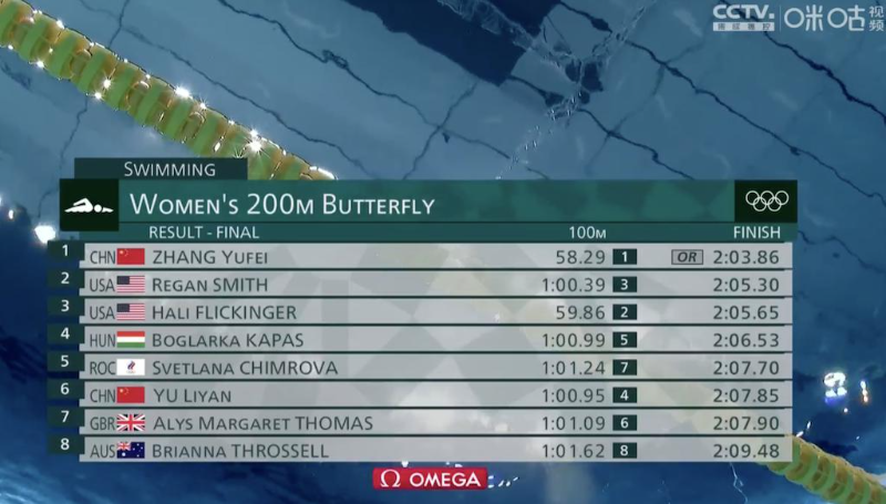 7月29日上午,东京奥运女子200米蝶泳决赛进行,首次参加奥运会的深圳健儿俞李妍在第2泳道出发,以2分07秒85获得第六名。另一中国健儿张雨霏以2分03秒86夺冠,创造了新的奥运纪录。