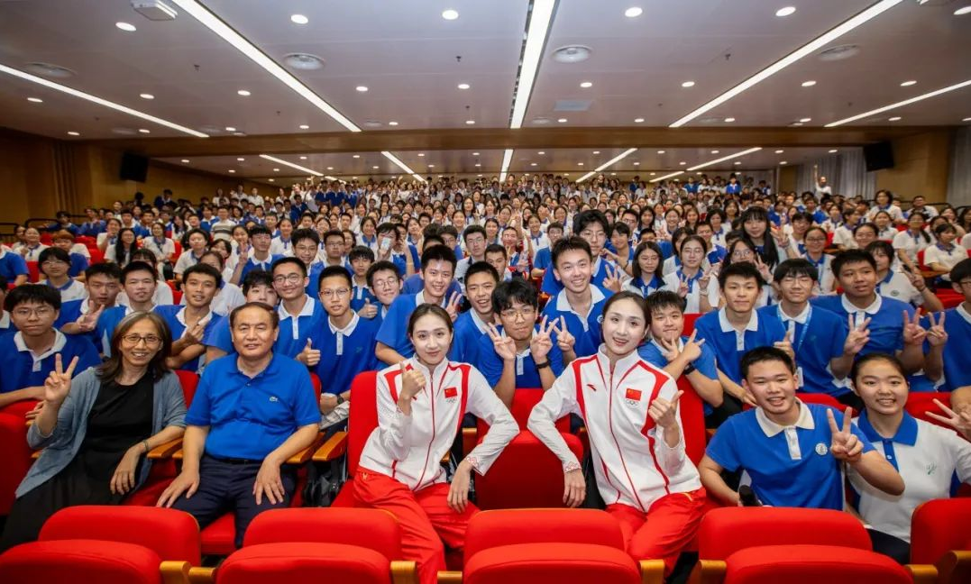 9月9日,巴黎奥运会跳水男子3米板冠军谢思埸来到华南师范大学附属中学,向学校师生分享他在跳水项目的训练经历,以及如何面对比赛压力、坚持梦想等。