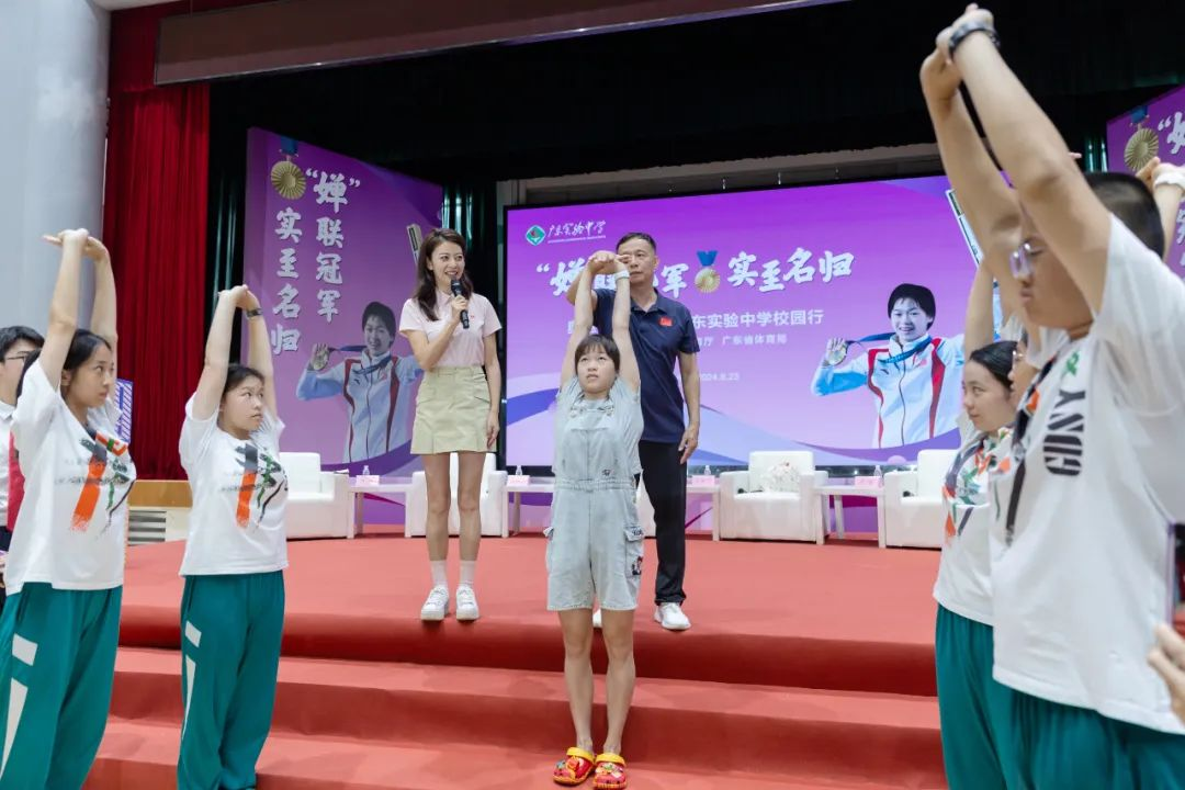 风采展示环节上,王柳懿、王芊懿重现巴黎奥运会花样游泳比赛入水前的招牌动作——豹子步,两位深中学子在现场进行学习和展示,获得奥运冠军们的高度赞扬。